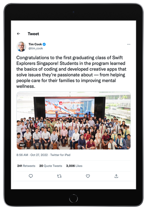 ![]() CEO of Apple, Mr. Tim Cook, congratulated the first graduating class of SES on Twitter |